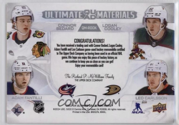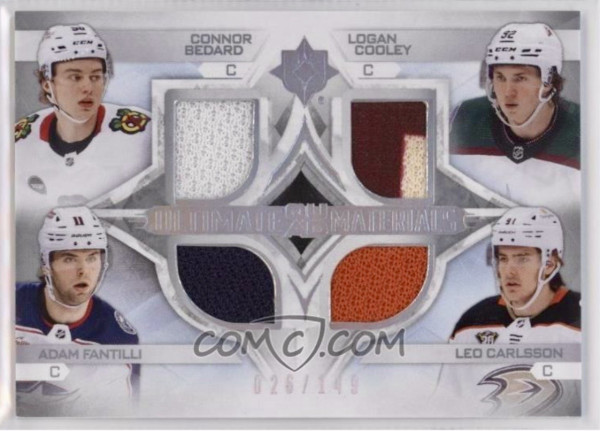 23-24 Ultimate Collection Quad Materials, Connor Bedard, Logan Cooley, Adam Fantilli, Leo Carlson /149