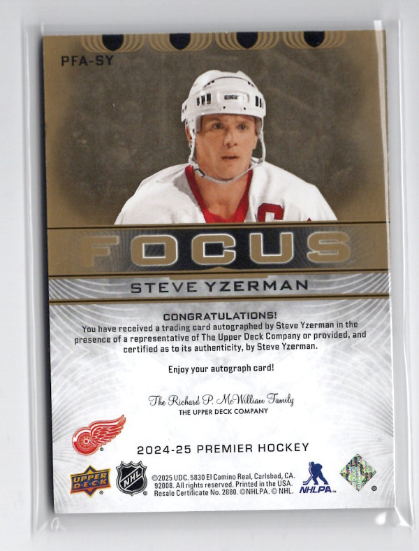 24/25 UD PREMIER FOCUS AUTOGRAPH GOLD #PFA-SY STEVE YZERMAN (04/15)