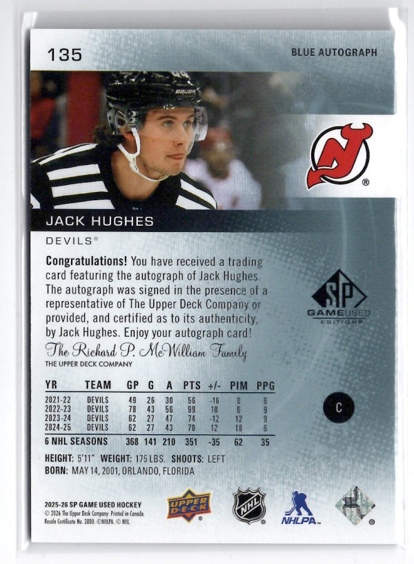 25/26 SP GAME USED BLUE AUTOGRAPH SSP #135 JACK HUGHES