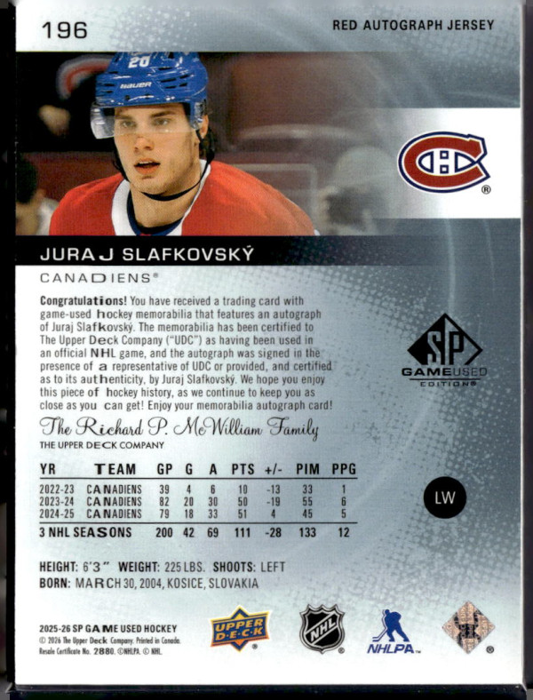 25/26 SP GAME USED RED AUTOGRAPH JERSEY #196 JURAJ SLAFKOVSKY (30/35)