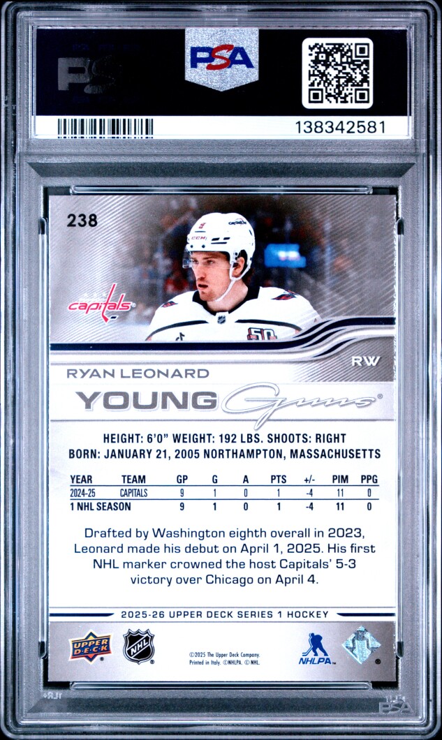 25/26 UD SERIES 1 YOUNG GUNS #238 RYAN LEONARD RC PSA 10