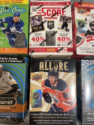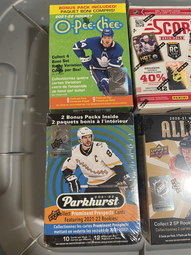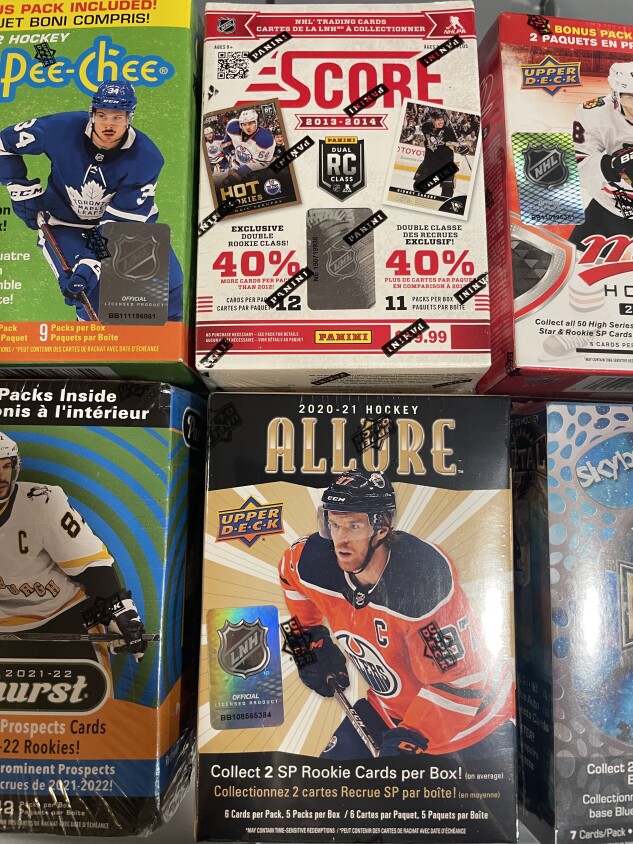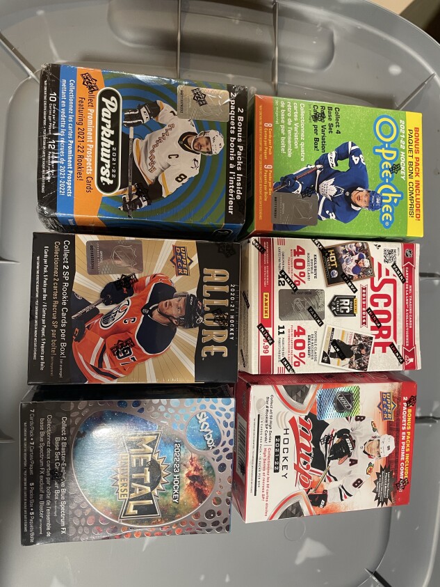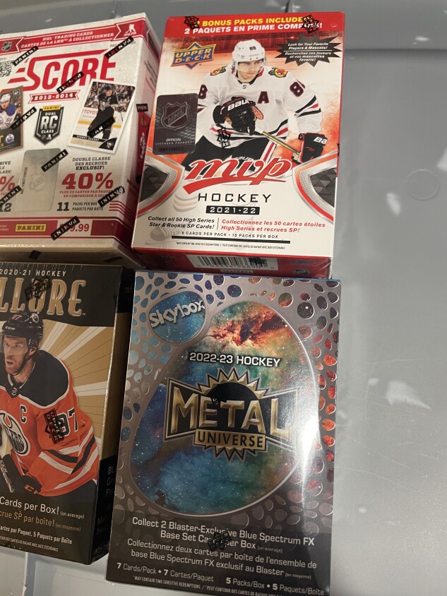 Sealed boxes 2021-22 O-Pee-Chee, 2013-14 Score, 2021-22 Upper Deck MVP, 2021-22 Parkhurst, 2020-21 Allure, 2022-23 Skybox Metal Universe