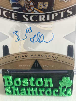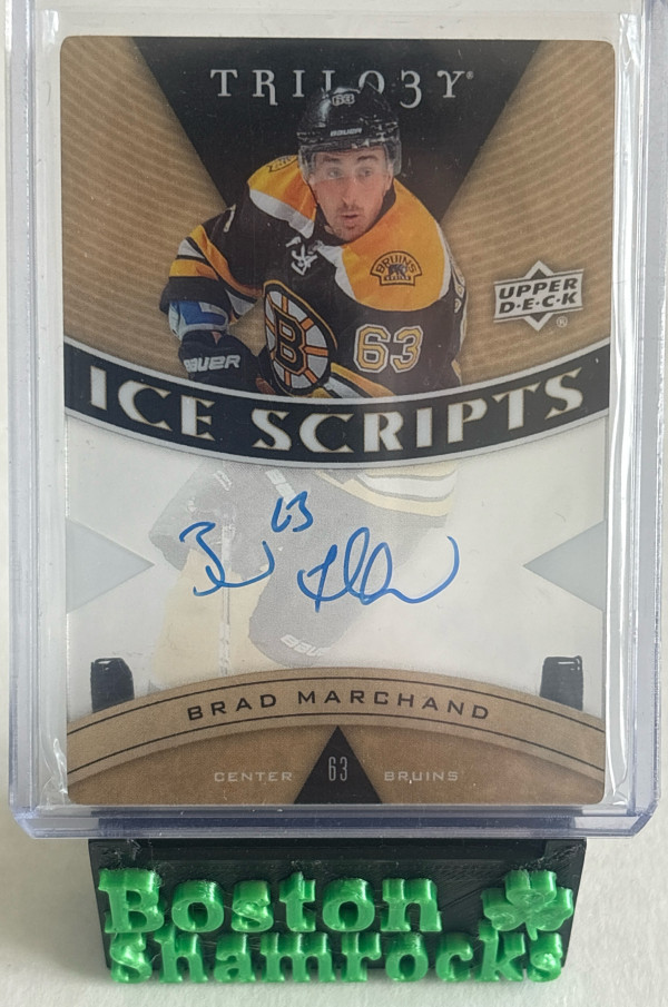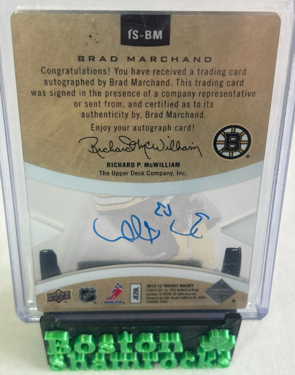 Brad Marchand 2012-13 Upper Deck Trilogy Ice Scripts Autograph on card in bold blue ink. Thick Acetate card.