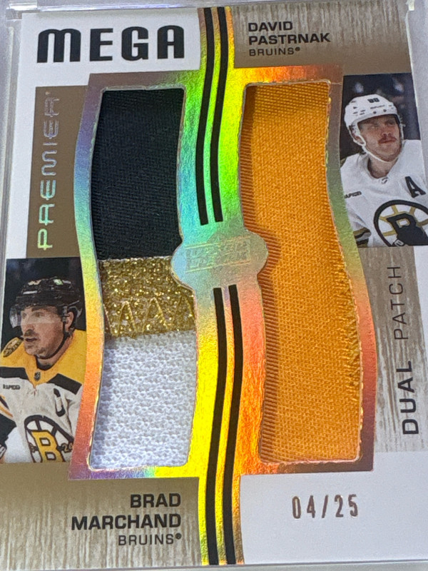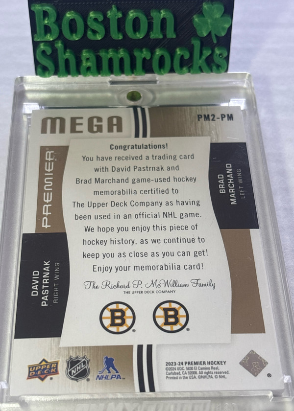 Brad Marchand and David Pastrnak 2023-24 Upper Deck Premiere Mega Dual Game Used Jersey Patch Relics
