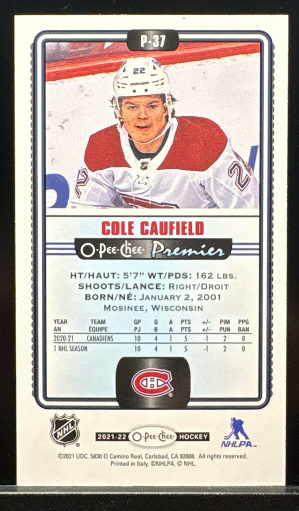 Cole Caufield, 2021-22 O-Pee-Chee Premier, Rookie, Tall Boys, Patterned Foil, SP