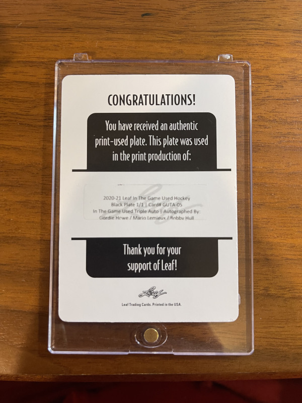 HOWE, LEMIEUX, HULL, 2020 Leaf ITG Hockey Plate Auto #GUTA-05, 1/1
