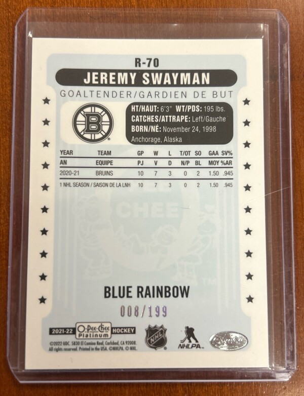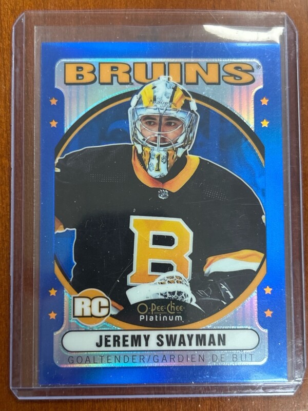 Jeremy Swayman 21/22 OPC Platinum Blue Rainbow Retro Rookie 8/199