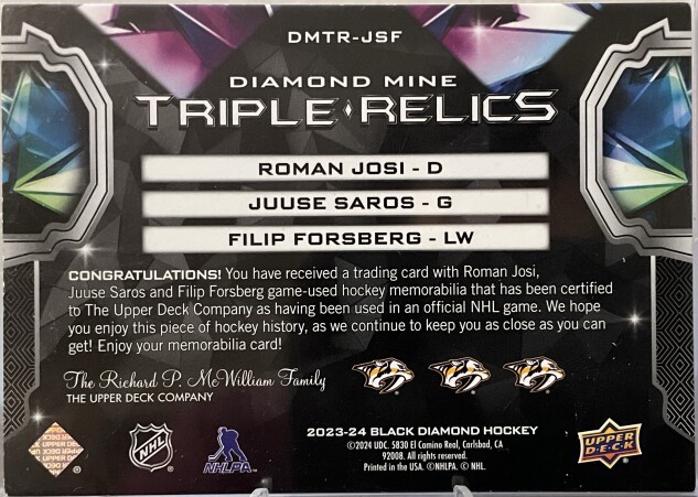 2023-24 Black Diamond Diamond Mine Triple Relics Roman Josi Juuse Saros Filip Forsberg