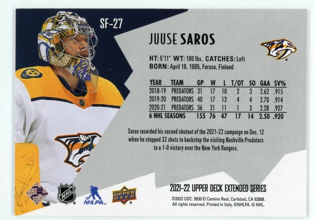 Juuse Saros 2021-22 Upper Deck SPx Finite /2999 #SF-27