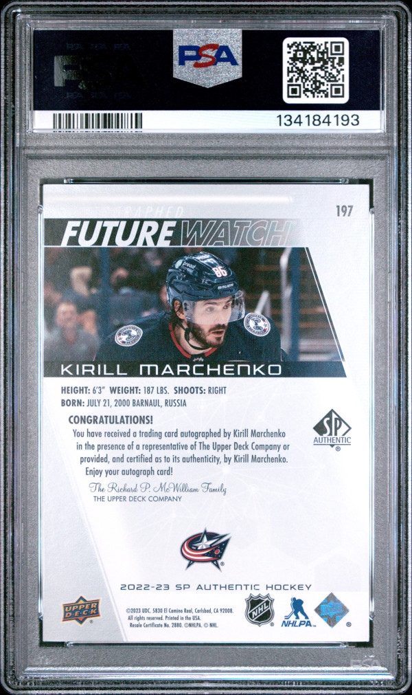 Thanks for your looking at my listing : Kirill Marchenko 2022-23 Upper Deck SP Authentic Future Watch Autograph PSA 9 . Let me know if you have any questions!
