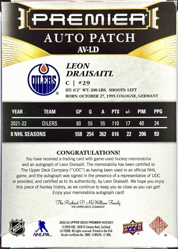 Leon Draisaitl 2022-23 Premier Star Auto Patch 09/15