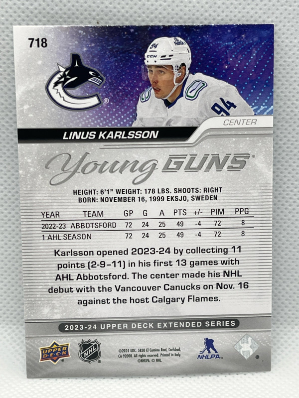 LINUS KARLSSON 2023-24 Extended Series Silver Outburst Young Guns