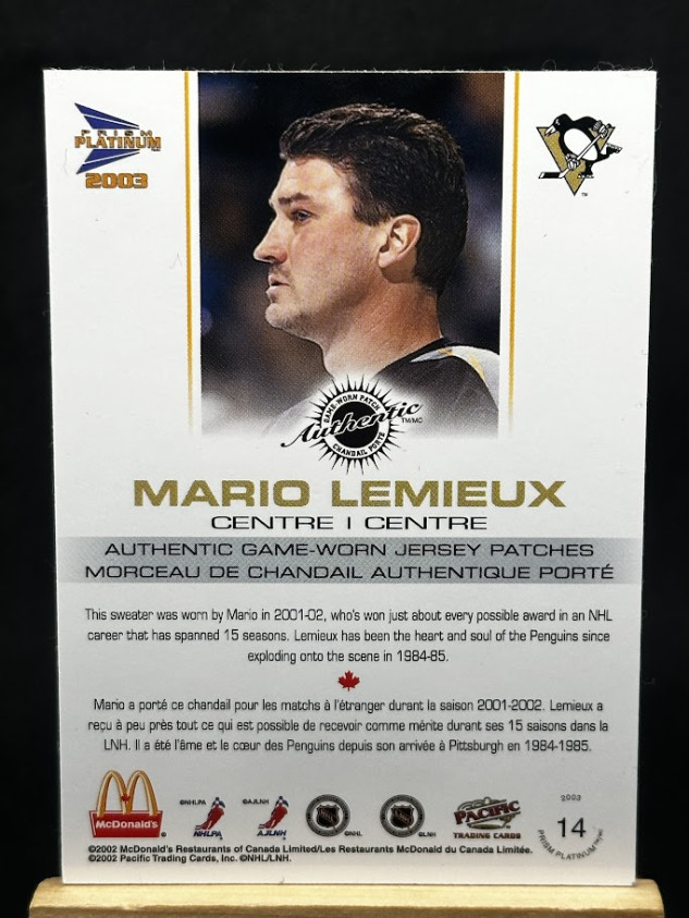 You are purchasing a Mario Lemieux 2002 Pacific Prism Platinum McDonald's Patch 3 Color 162/184 #14 .