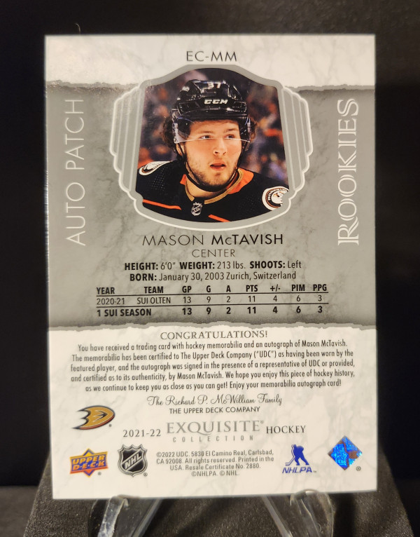 Mason Mctavish Exquisite Rookie Auto Patch 6/37 3 clr patch