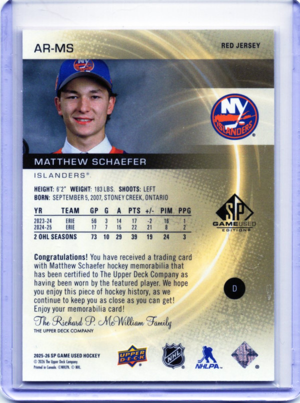 Matthew Schaefer RC 2025-26 Upper Deck SP Game Used #AR-MS Red Jersey Islanders