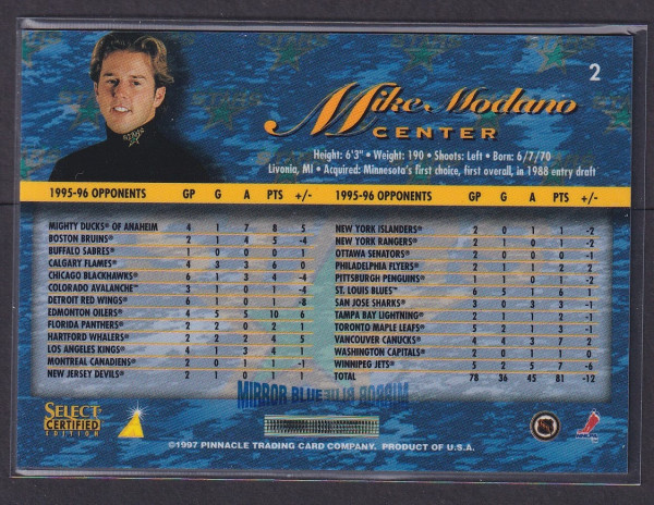 MIKE MODANO - 1996 Pinnacle Select Certified MIRROR Blue W/ Coating #2