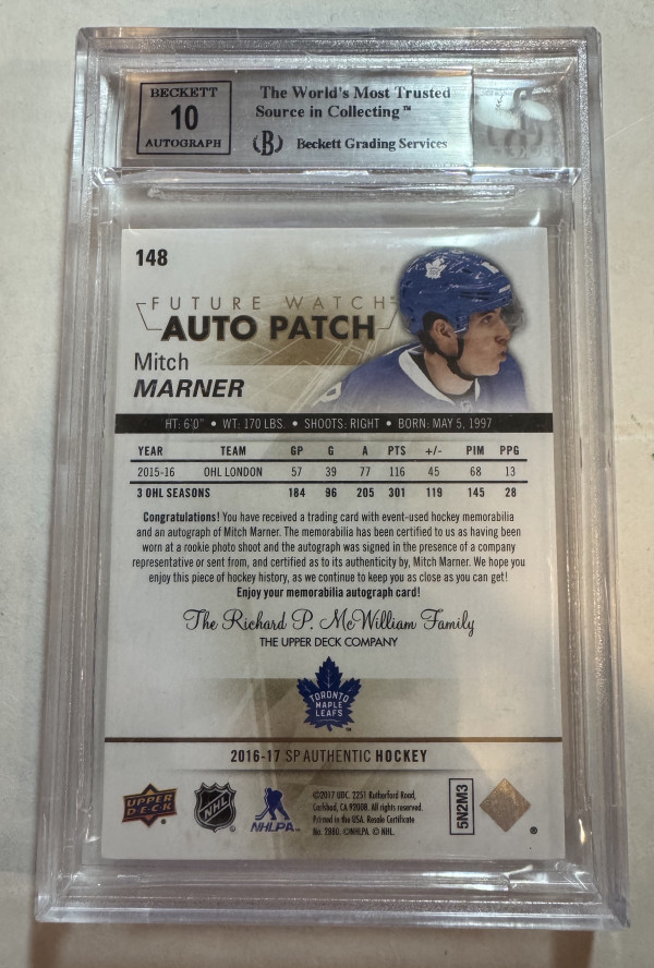MITCH MARNER - 2016 SP Authentic Future Watch Auto Patch #148, /100, BGS 8.5/10