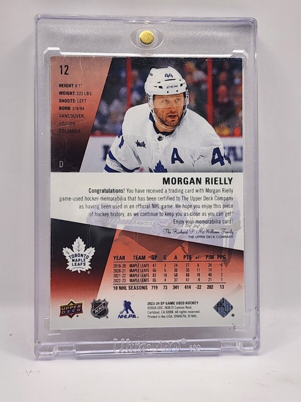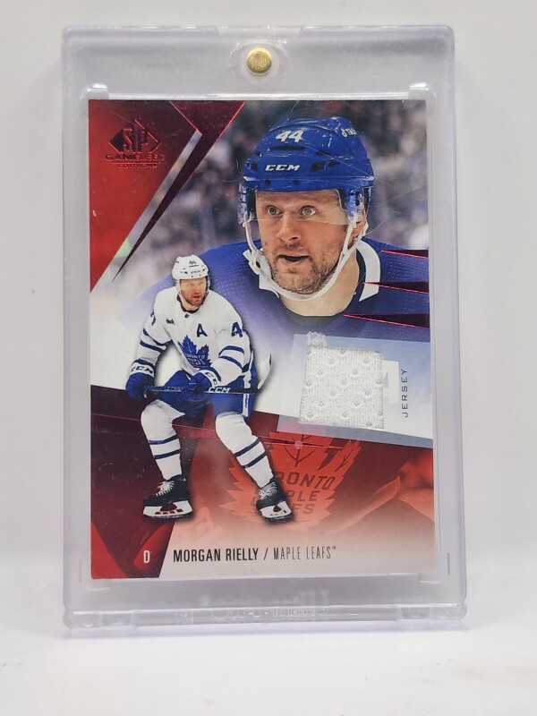 The product is a 2023-24 Upper Deck SP Game Used Patch trading card featuring NHL player Morgan Rielly from the Toronto Maple Leafs. This original card includes a patch from a jersey used by the player during the Stanley Cup Finals, making it a valuable memorabilia item for collectors and fans. The card is made of card stock with a 75 Pt. thickness and features English language text. This non-autographed card is part of the Standard size set and is a sought-after item for ice hockey trading card enthusiasts.