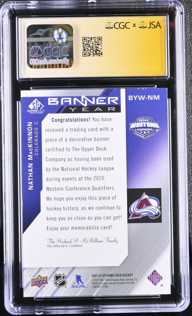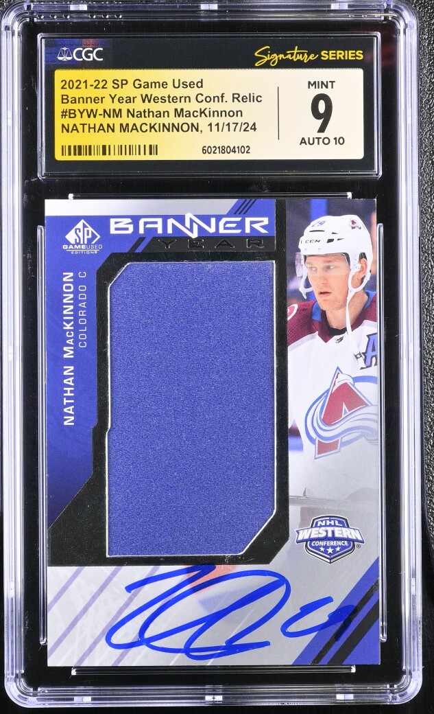 Nathan MacKinnon 2021-22 SP Game Used Banner Year Western Conf. Relic Auto CGC 9