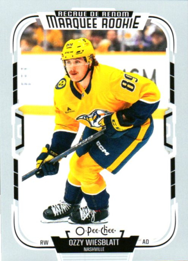 2025-26 O-Pee-Chee Marquee Rookie card featuring Nashville Predators forward Ozzy Wiesblatt. Classic O-Pee-Chee design highlighting the young NHL prospect. A nice rookie card for Predators fans and rookie collectors.