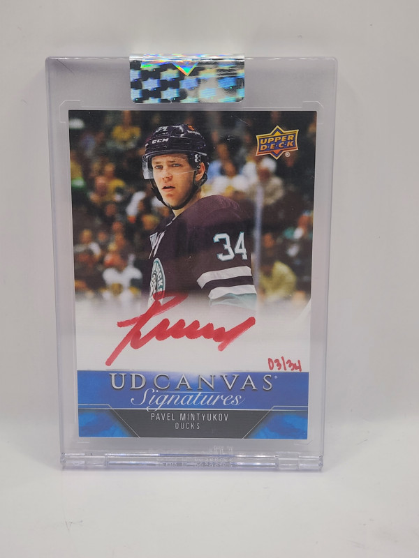Thanks for your looking at my listing Pavel Mintyukov 2023-24 Upper Deck Clear Cut Canvas Signatures Autograph Red /34. Let me know if you have any questions!