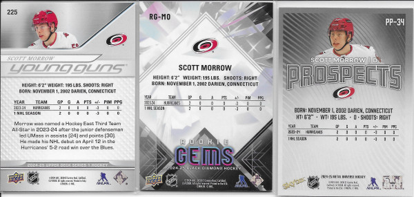 Three card, Scott Morrow rookie lot. 1x Young Guns, 1x Black Diamond Rookie Gems (167/399), and 1x Metal Universe Premium Prospects.