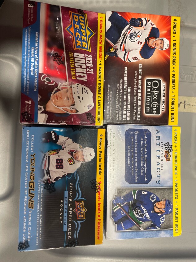 (1) 2019-20 O-Pee-Chee Platinum (4) total factory sealed boxes. (1) 2018-19 Hockey Artifacts Blaster Box (1) 2018-19 Upper Deck Series 2 Blaster Box (1) 2020-21 Upper Deck Extended Series Blaster Box