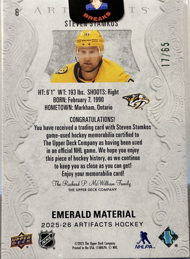 2025-26 Artifacts Emerald Material 17/65 Steven Stamkos