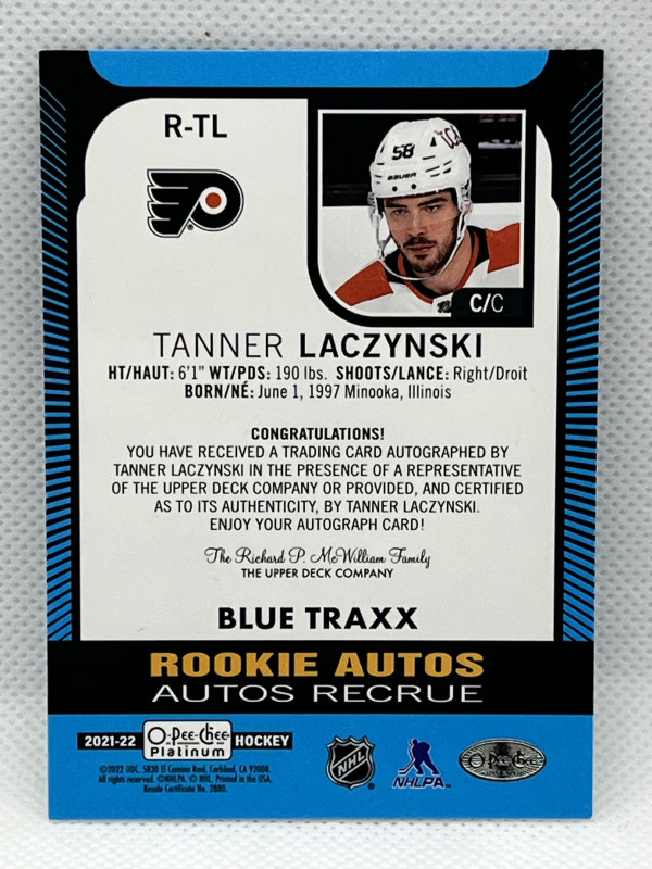TANNER LACZYNSKI 2021-22 O-Pee-Chee Platinum Blue Traxx Auto #R-TL