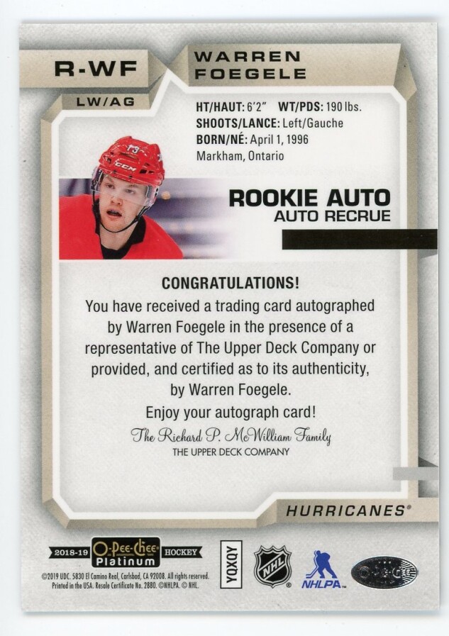 Warren Foegele 2018-19 O-Pee-Chee Platinum Rookie Autograph #R-WF