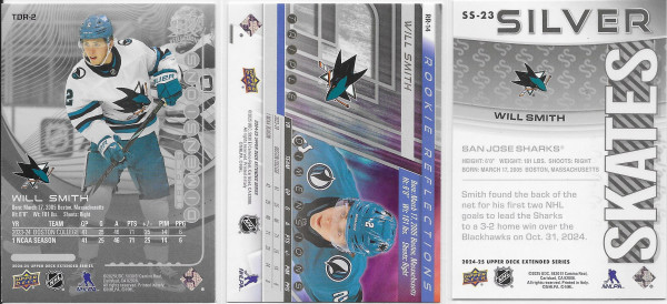 Three card, Will Smith Rookie lot. All 2024-25 Upper Deck Extended Series. 1x Silver Skates SS-23, 1x Rookie Reflections RR-14, 1x Reflections TDR-2.