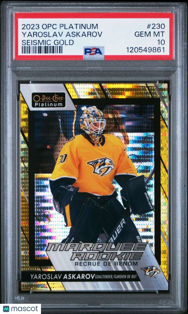 You are purchasing a Yaroslav Askarov 2023-24 UD O-Pee-Chee Platinum Seismic Gold 15/50 #230 PSA 10.