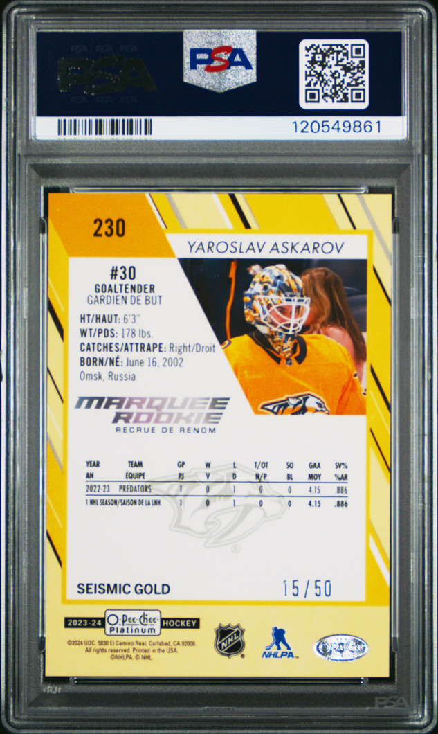 Yaroslav Askarov 2023-24 UD OPC Platinum Seismic Gold 15/50 #230 PSA 10 Rookie