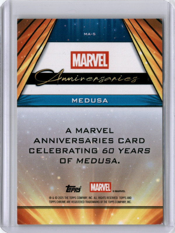 You are purchasing a 2025 TOPPS CHROME MEDUSA 60TH ANNIVERSARY SILVER. You will receive the exact item in the photographs. Thank you for looking. Check our SM for news and updates 2Kingscards