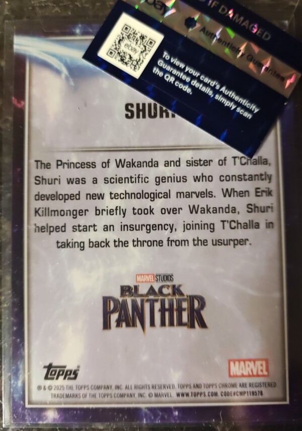 2025 Topps Chrome Marvel Studios Shuri is a 1 of 1 Padparadscha Sapphire Collectable.