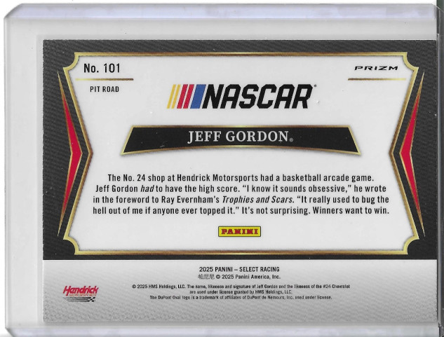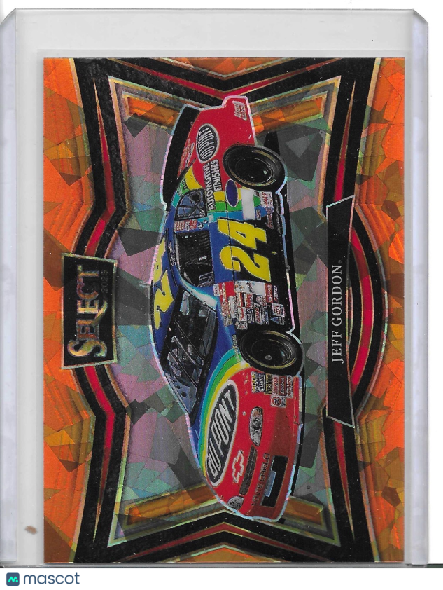 The product is a 2025 Panini Select NASCAR trading card featuring Jeff Gordon from the Pit Road set. This standard-sized card is made of card stock with a thickness of 35 Pt. It is an original, English-language card with an Orange Ice Prizm parallel/variety, representing the Hendrick Motorsports team. The card is not autographed and is not a vintage reprint, making it a desirable collectible item for fans of auto racing and sports trading cards.
