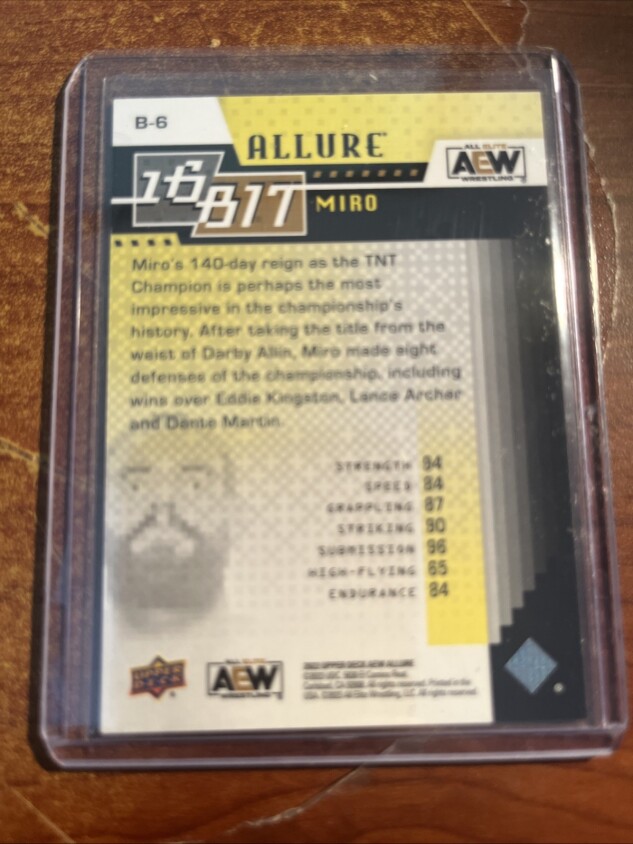 You are purchasing a 2022 Upper Deck Allure AEW Miro #B-6 [Base] Insert. You will receive the exact item in the photographs. Thank you for looking.