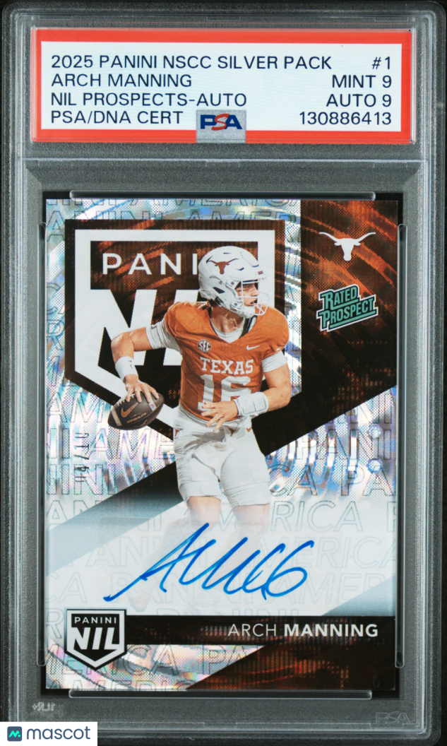 You are purchasing a 2025 National Convention Silver Pack NIL Prospects Arch Manning Auto 4/10 #1 PSA 9 Auto 9. You will receive the exact item in the photographs. Thank you for looking.