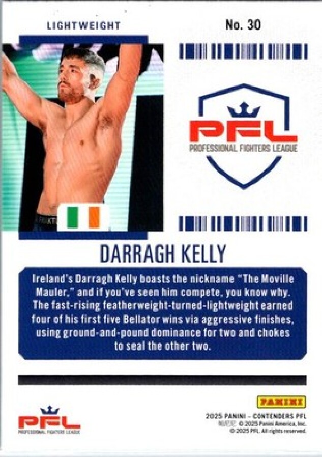 This is a nice example of a 2025 Panini Contenders PFL #30 Darragh Kelly Season Ticket Silver