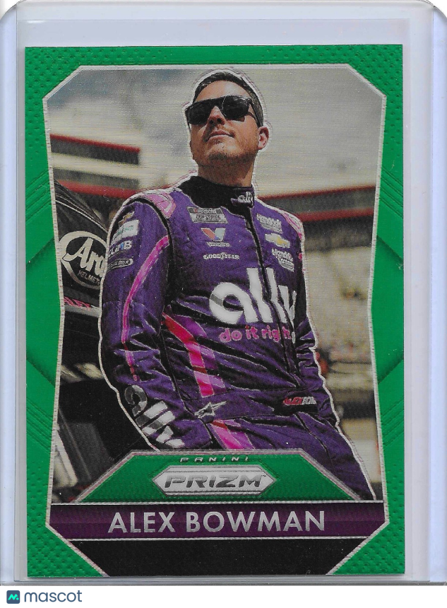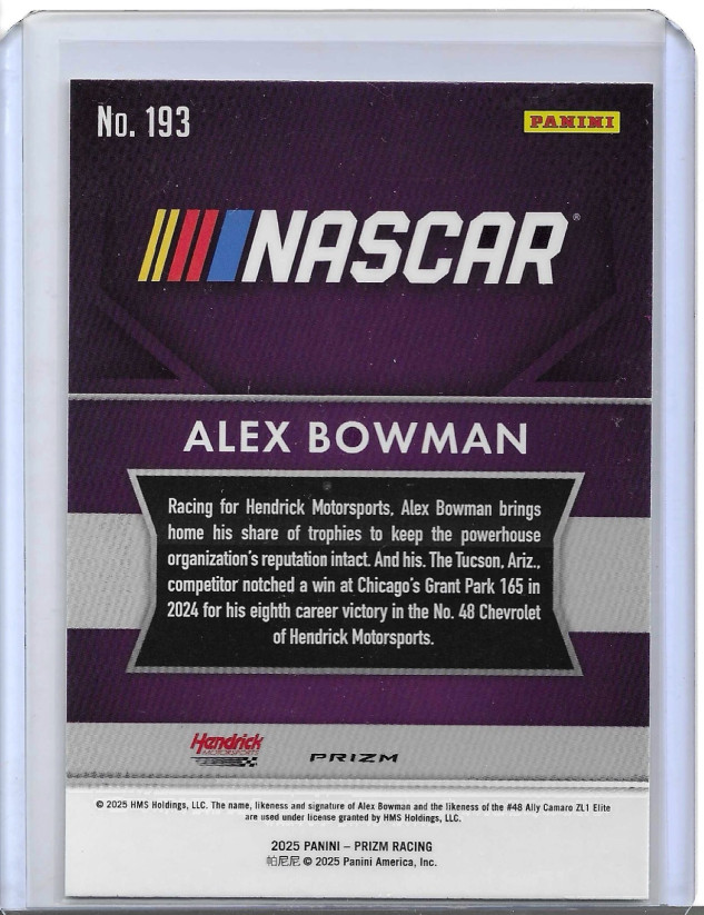 The 2025 Panini Prizm Racing Alex Bowman #193 Throwback Green Prizm trading card is a collectible item featuring the NASCAR athlete Alex Bowman from the Hendrick Motorsports team. This card is part of the Throwback insert set for the 2025 season and is made of standard 20 Pt. card stock. With a unique green prizm parallel variety, this English-language card is a sought-after piece for fans and collectors alike. The card is authenticated by Panini Authentic and is a valuable addition to any sports trading card collection.