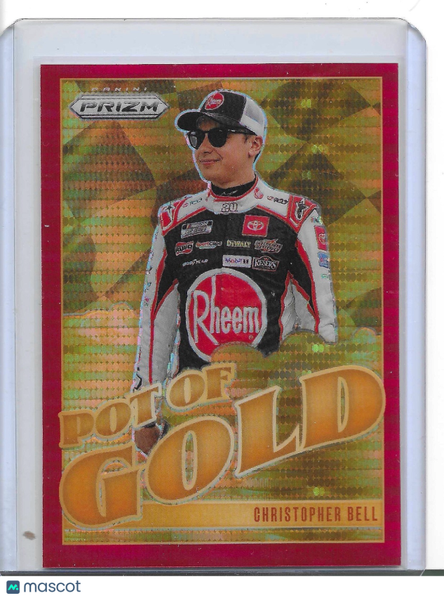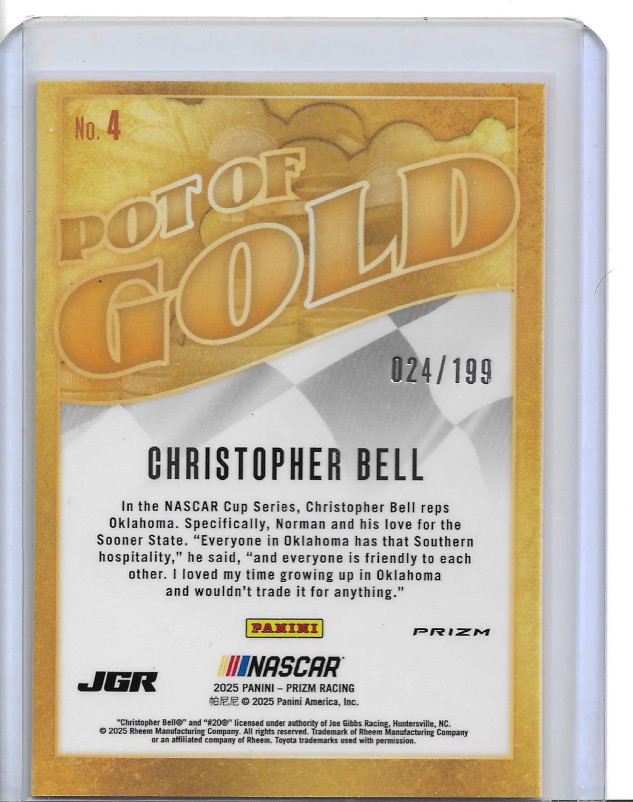 The product is a 2025 Panini Prizm Racing Christopher Bell #4 Pot Of Gold Red Pulsar /199 sports trading card. This card features Christopher Bell from Joe Gibbs Racing and is part of the 2025 Panini Prizm set. The card is made of 20 Pt. card stock and is an original licensed reprint with a Panini Authentic autograph authentication. It is a limited edition card with a unique Red Pulsar parallel variety and is in English language. This collectible item is a standard size trading card for auto racing fans and collectors alike.
