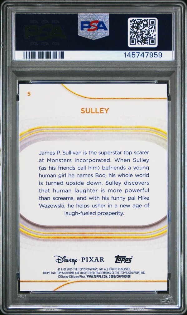 You are purchasing a 2025 Topps Chrome Disney Sulley #5 PSA 9. You will receive the exact item in the photographs. Thank you for looking.