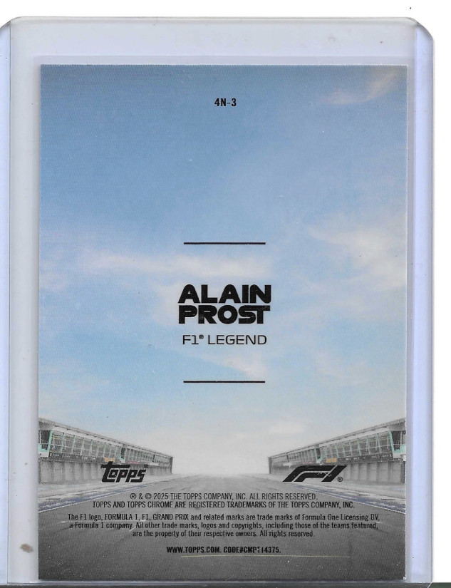 You are purchasing a 2025 Topps Chrome Alain Prost #4N-3 Chrome Insert 4 Topps. You will receive the exact item in the photographs. Thank you for looking.