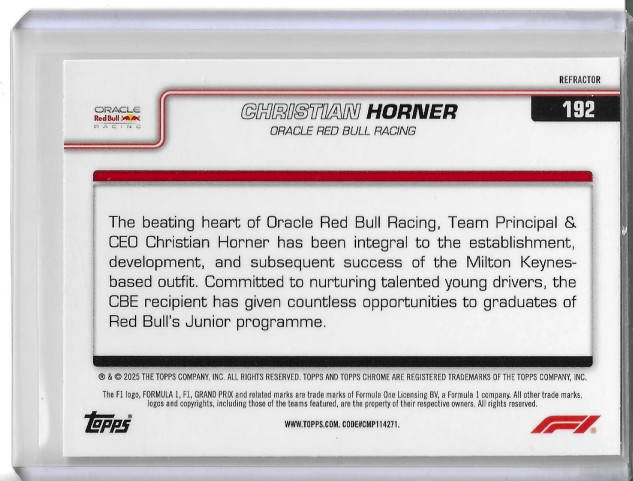 The 2025 Topps Chrome Formula 1 Christian Horner #192 Team Principal Refractor trading card is a highly collectible item for fans of Formula 1 racing. This card features a standard size, 35 Pt. card thickness, and is part of the 2025 Topps Chrome Formula 1 set. It showcases Christian Horner, the Team Principal of Oracle Red Bull Racing, in a vibrant refractor design. Manufactured by Topps in the United States, this original English-language card is a must-have for any sports trading card collector.