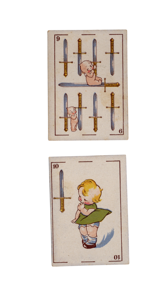 The Baraja (Deck of Cards) Fantasia game playing cards were released as a variety of sets with different backs. Variations included a full black & white landscape image, an all-blue illustrated image or a full color illustrated image. There were two sets, “Futbol” & “Sports”, that had the full color illustrated backs with a lower section dedicated to advertising. This section was typically advertising Spanish chocolate companies but are also found blank, without any advertiser listed. Both of these sets consisted of 48 cards.