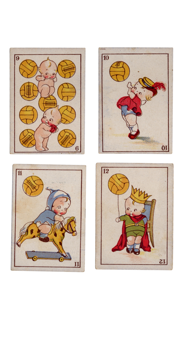 The Baraja (Deck of Cards) Fantasia game playing cards were released as a variety of sets with different backs. Variations included a full black & white landscape image, an all-blue illustrated image or a full color illustrated image. There were two sets, “Futbol” & “Sports”, that had the full color illustrated backs with a lower section dedicated to advertising. This section was typically advertising Spanish chocolate companies but are also found blank, without any advertiser listed. Both of these sets consisted of 48 cards.