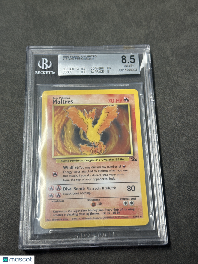 You are purchasing a 1999 Pokemon Fossil Unlimited Moltres HOLO R #12 BGS 8.5. You will receive the exact item in the photographs. Thank you for looking.
