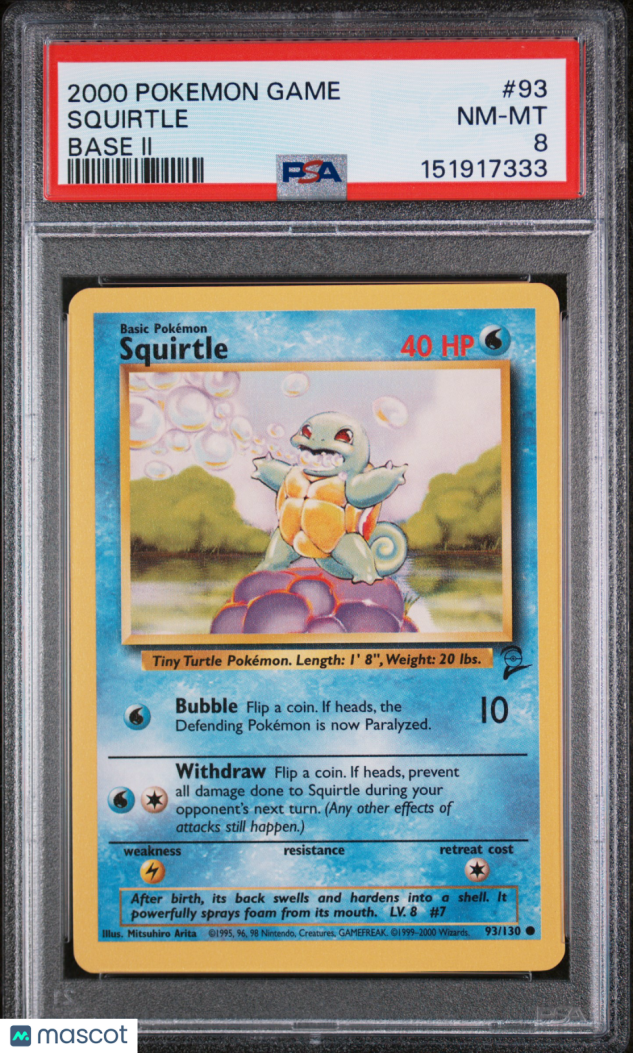 You are purchasing a 2000 Pokemon Game Base II Squirtle Base II PSA 8 #93. You will receive the exact item in the photographs. Thank you for looking.