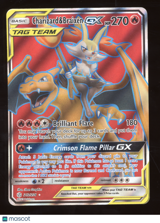 You are purchasing a 2019 Pokemon Sun & Moon Cosmic Eclipse Charizard & Braixen GX Rare Ultra #212/236. You will receive the exact item in the photographs. Thank you for looking.