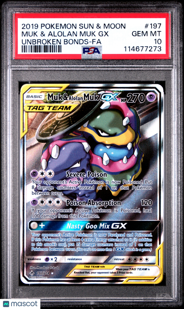 You are purchasing a 2019 Pokemon Sun & Moon Unbroken Bonds Muk & Alolan Muk GX Unbroken Bonds-Fa PSA 10 #197. You will receive the exact item in the photographs. Thank you for looking.